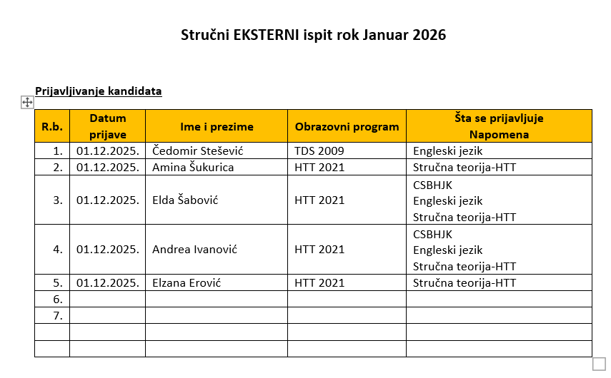 Prvog dana za polaganje stručnog ekternog ispita prijavilo se pet učenika i to je prikazano u sledečoj tabeli: