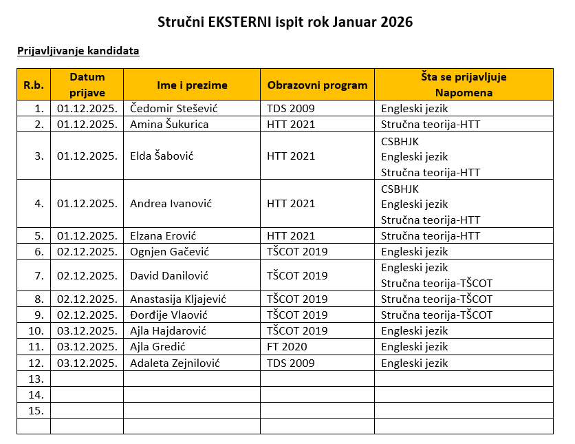 Posle tri dana prijava za polaganje stručnog ekternog ispita prijavilo se 12 učenika i to je prikazano u sledečoj tabeli: