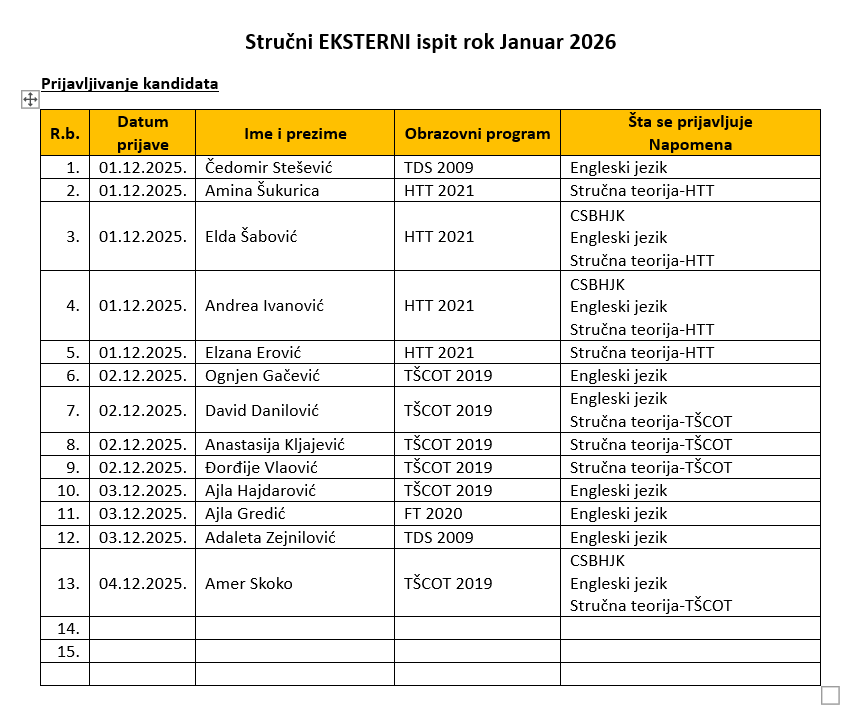 Posle četiri dana prijava za polaganje stručnog ekternog ispita prijavilo se 13 učenika i to je prikazano u sledečoj tabeli: