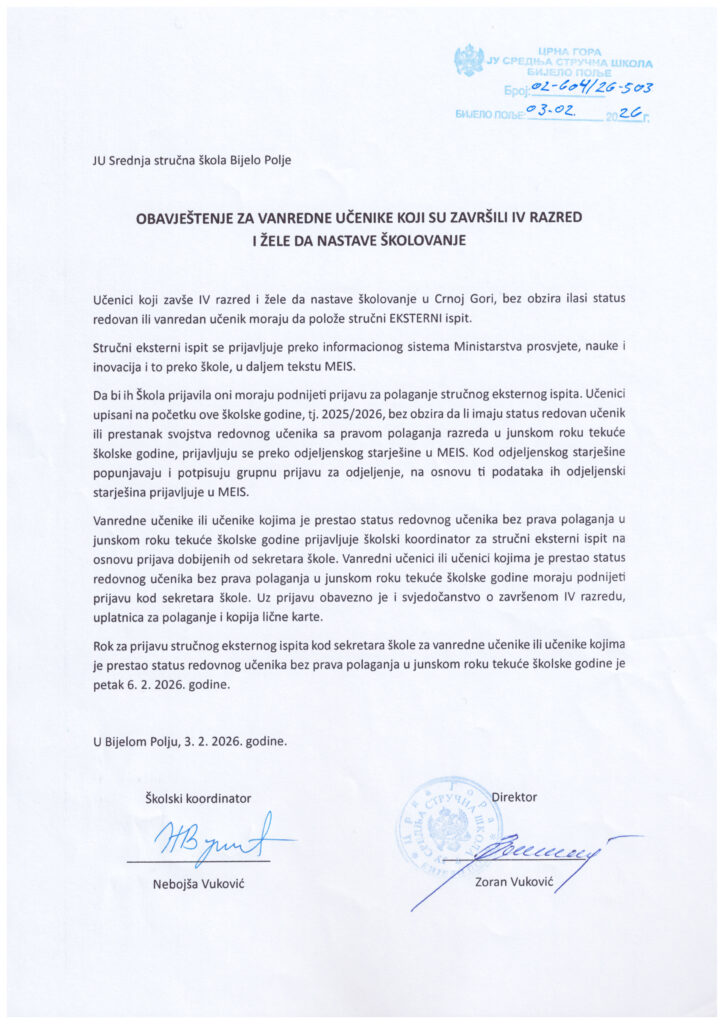 Rok za prijavu stručnog eksternog ispita kod sekretara škole za vanredne učenike ili učenike kojima je prestao status redovnog učenika bez prava polaganja u junskom roku tekuće školske godine je petak 6. 2. 2026. godine.
